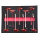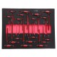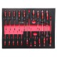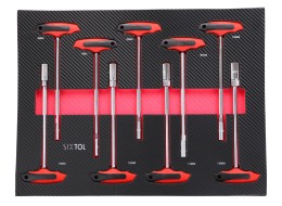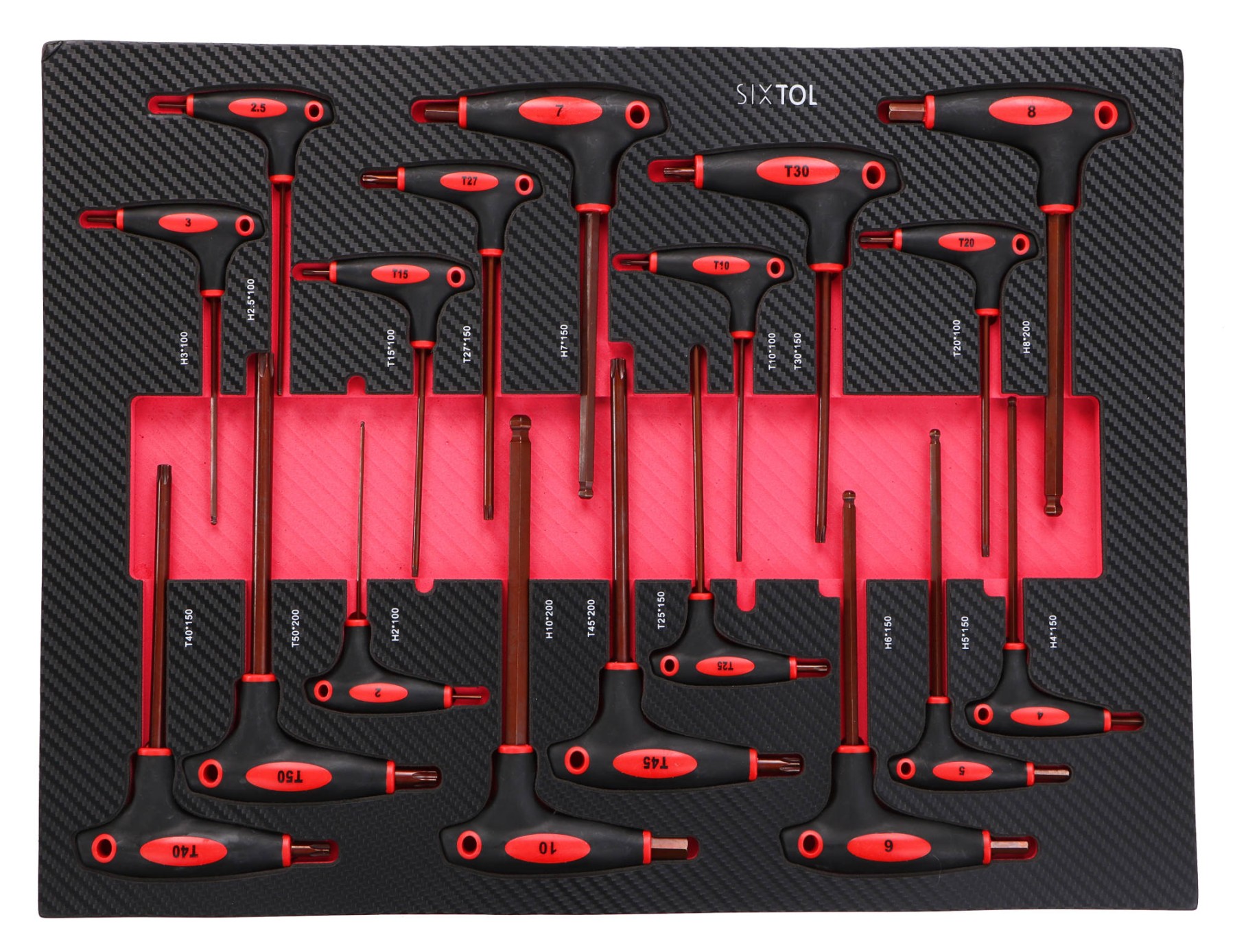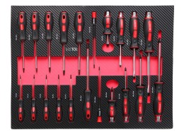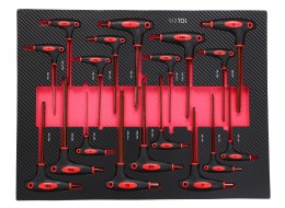 - T-kľúče HEX (imbus): H2 × 100 mm; H2.5 × 100 mm; H3 × 100 mm; H4 × 150 mm; H5 × 150 mm; H6 × 150 mm; H7 × 150 mm; H8 × 200 mm; H10 × 200 mm- 7. Zásuvka – 21x skrutkovače (materiál 40Cr)