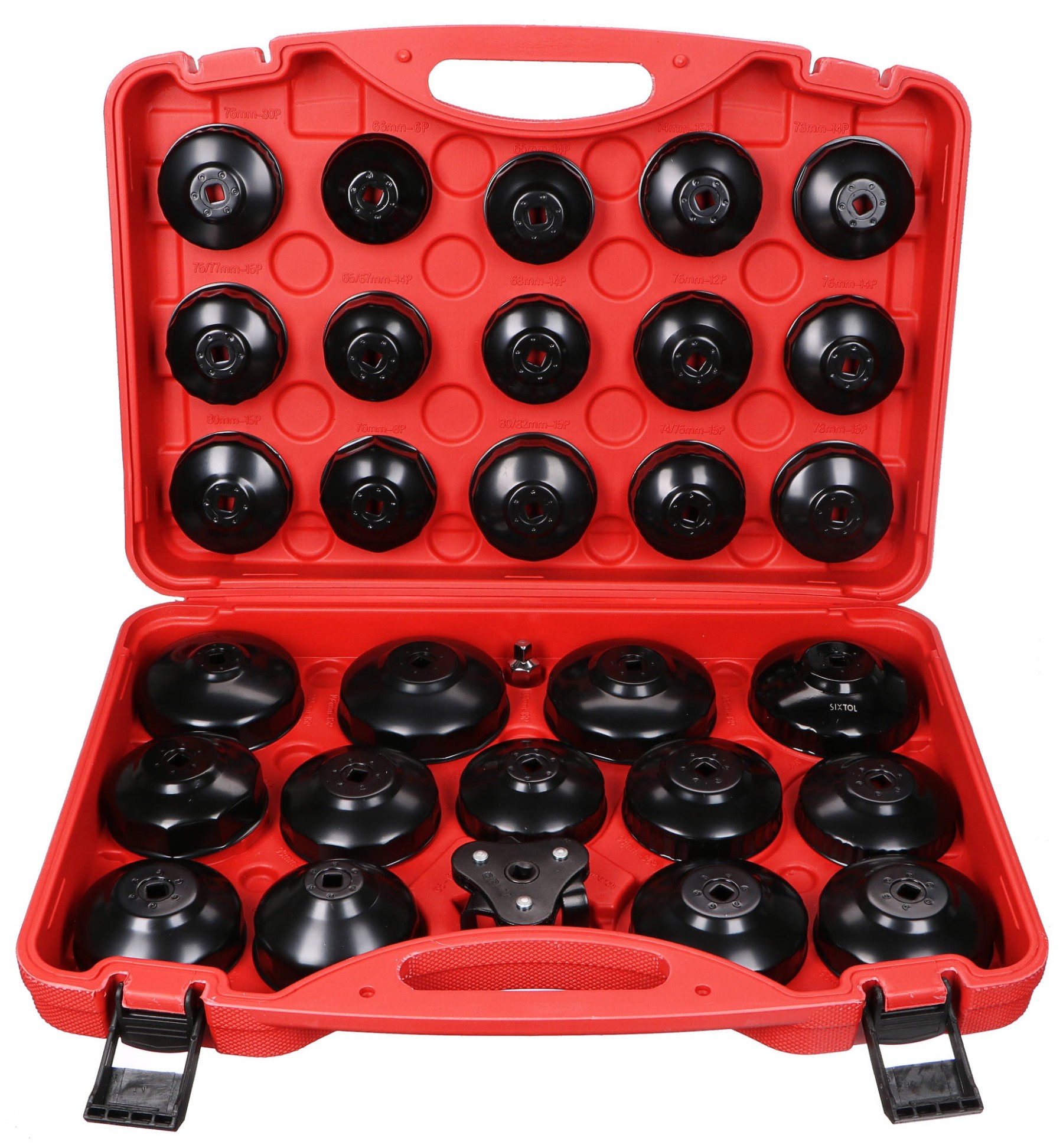Univerzálna sada násadkových kľúčov na olejové filtre SIXTOL MECHANIC OIL WRENCH 30 je nevyhnutným nástrojom pre povoľovanie a uťahovanie olejových filtrov v osobných autách aj dodávkach. Súprava obsahuje 30 najpoužívanejších veľkostí násadkových kľúčov vyrobených z nehrdzavejúcej ocele, ktoré sú vhodné pre širokú škálu značiek vozidiel. Súčasťou sady je aj trojčeľusťový kľúč na olejové filtre s priemerom 65-120 mm a redukcia z 1/2" na 3/8". Kľúče sú chránené proti korózii a sú vhodné pre krútiaci moment až 115 Nm. Súprava je ideálna na použitie v každom servise alebo dielni a je uložená v robustnom plastovom kufri pre jednoduché prenášanie a skladovanie.