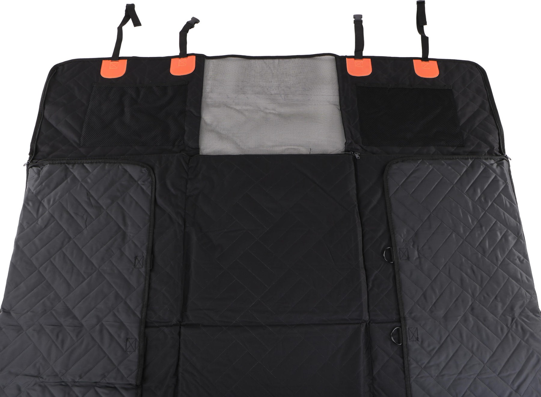 Ochranná deka do auta pod psa SIXTOL CAR KESSIE je navrhnutá pre bezpečnú a pohodlnú prepravu psa na zadných sedadlách bez rizika znečistenia alebo poškodenia interiéru vozidla. Odolný materiál z vodeodolnej tkaniny Oxford 600D účinne chráni čalúnenie pred blatom, chlpmi, vlhkosťou aj škrabancami. Vďaka predĺženej ploche deka kryje nielen sedadlá, ale aj priestor pri dverách, čím uľahčuje nastupovanie a vystupovanie psa. Praktické upevňovacie popruhy zabezpečujú stabilné uchytenie k opierkam hlavy a zabraňujú posunu deky počas jazdy. Súčasťou konštrukcie sú aj sieťované časti pre lepšie prúdenie vzduchu a vizuálny kontakt so psom.