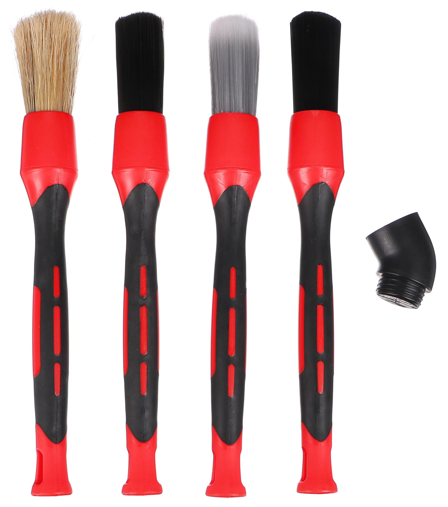 Praktická sada precíznych štetcov CAR DETAILING BRUSH 4 so štyrmi vymeniteľnými nadstavcami je ideálnou voľbou pre detailné a efektívne čistenie vášho vozidla. Obsahuje 4 rôzne nadstavce, ktoré umožňujú jednoduché a dôkladné čistenie aj ťažko dostupných miest, ako sú napríklad vetracie otvory, škáry medzi sedadlami alebo palubná doska. Každý štetec je opatrený štetinami z iného materiálu - prasiacie štetiny, polypropylén, ostré hodvábie a syntetické hodvábie. Mäkké štetiny šetrne odstránia prach a nečistoty bez poškriabania povrchu a sú vhodné pre interiér vozidla. V sade je tiež 45° nadstavec pre prístup do ťažko dostupných miest. Ergonomický dizajn rukovätí zaisťuje pohodlné držanie. Táto sada je nepostrádateľným pomocníkom pre každého, kto si potrpí na čistotu a detail.