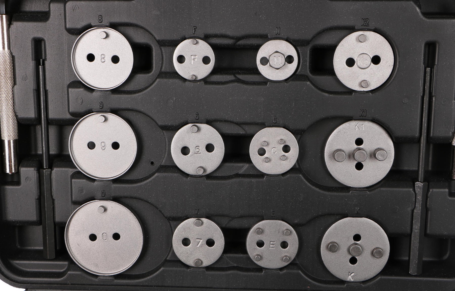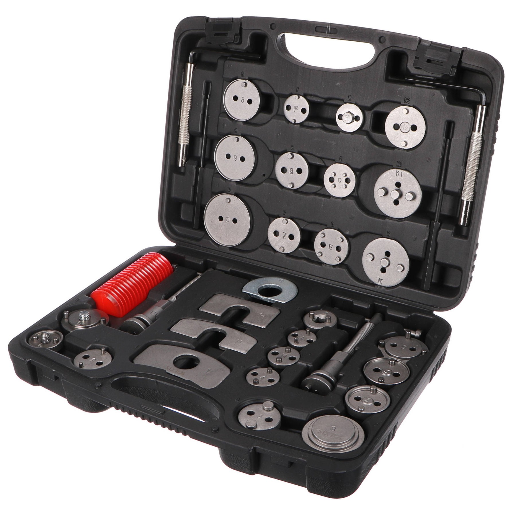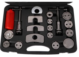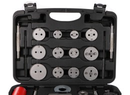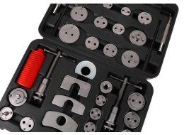 pravotočivú aj ľavotočivú stlačovaciu závitnicu s magnetom, štyri dorazy, dva imbusové kľúče, úderníky, nádobku na mazivo a 24 rôznych adaptérov. U vozidiel s tŕmenmi kotúčových bŕzd a s integrovanou jednotkou ručnej brzdy sa spätné vracanie brzdových piestov vykonáva spätným otáčaním, u ostatných vozidiel spätným stlačením týchto piestov.