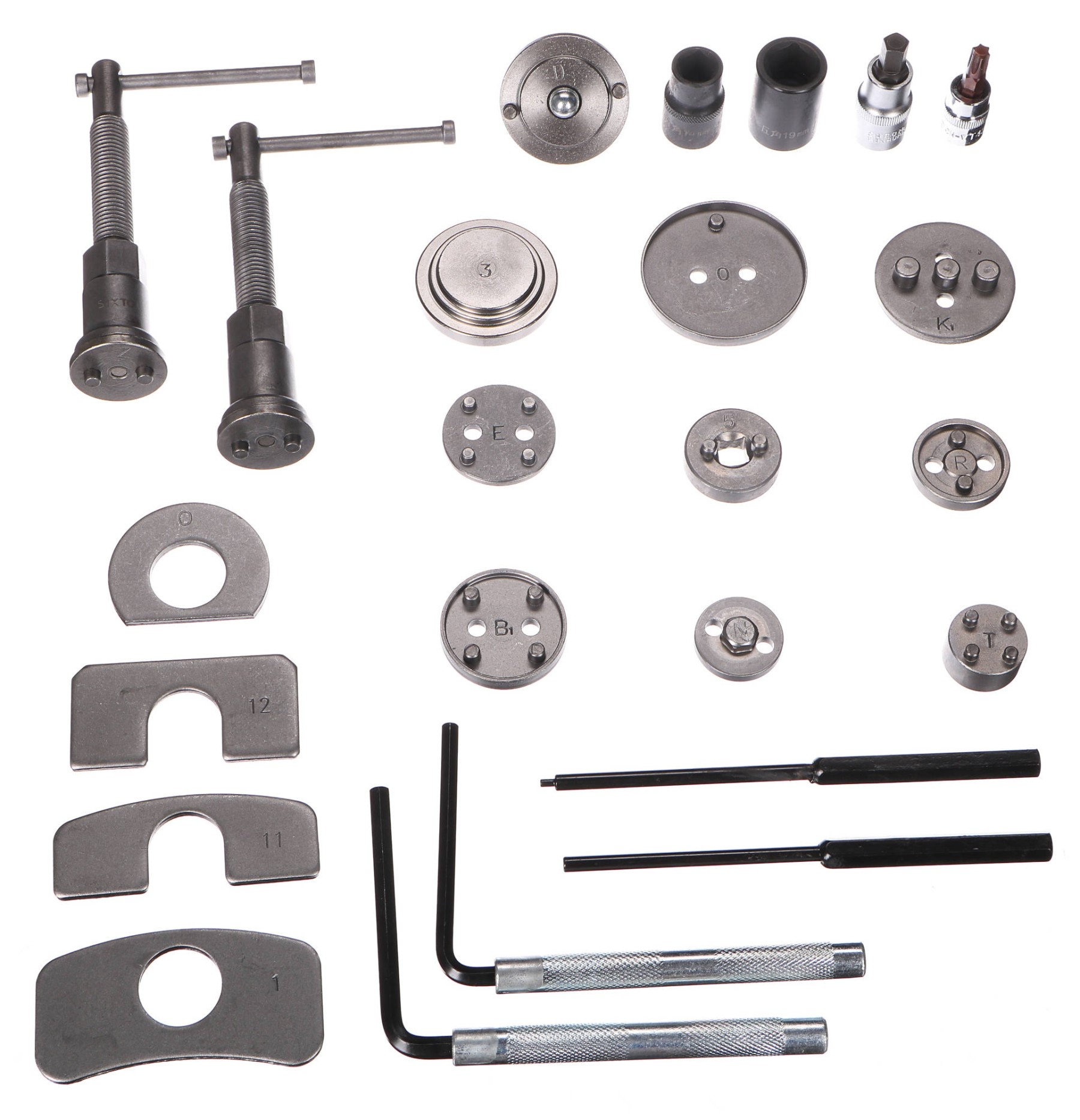 obsahuje pravotočivú i ľavotočivú stláčaciu závitnicu s magnetom, štyri dorazy, dva imbusové kľúče, úderníky, nádobku na mazivo a množstvo rôznych adaptérov. Pri vozidlách so strmeňmi kotúčových bŕzd a s integrovanou jednotkou ručnej brzdy sa spätné vracanie brzdových piestov vykonáva spätným otáčaním, pri ostatných vozidlách spätným zatlačením týchto piestov.