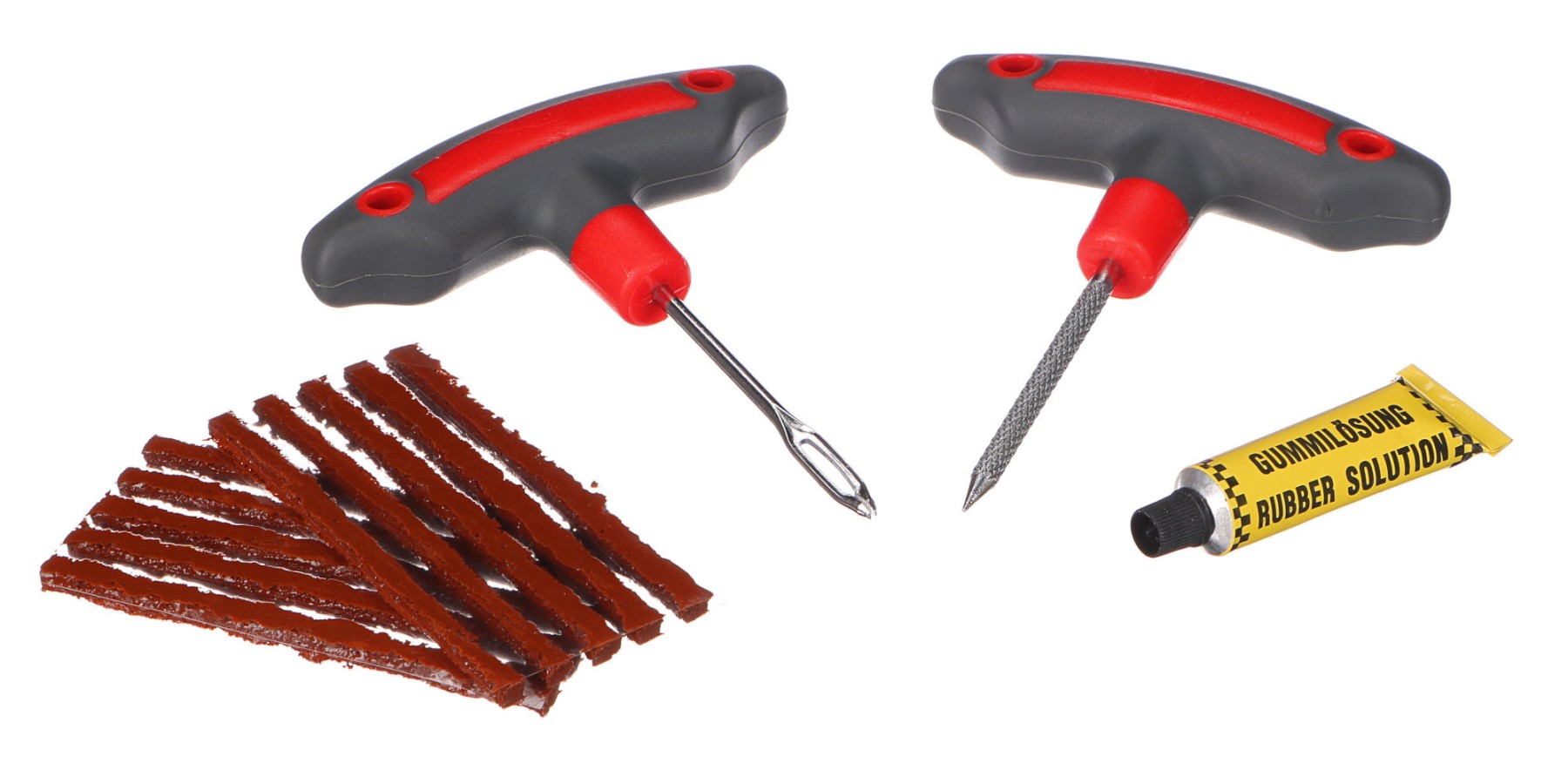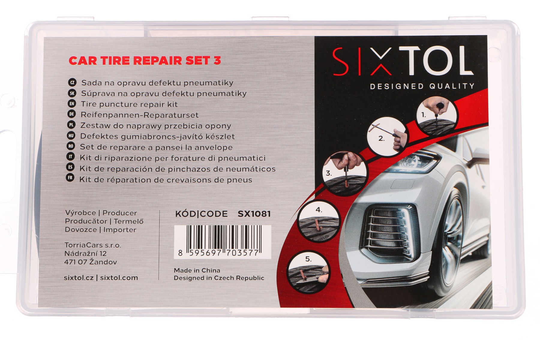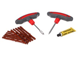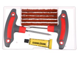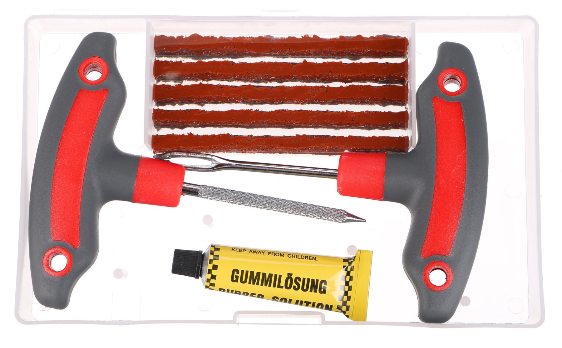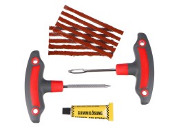 Súprava na opravu defektu pneumatiky CAR TIRE REPAIR SET 3 je nevyhnutným pomocníkom každého vodiča. Umožní vám ľahko, rýchlo a dočasne vyriešiť nečakaný defekt bez nutnosti navštíviť servis bez ohľadu na to, či ste na dlhej ceste, v práci alebo doma.Návod na použitie: Nájdite miesto, kde je pneumatika prepichnutá, prípadne odstráňte predmet, ktorý spôsobil defekt. Do otvoru zasuňte prieťažník a následne ho preťahujte smerom hore a dole - do doby než bude ľahko prechádzať otvorom - týmto je otvor vyčistený a pripravený. Knôt zbavený ochrannej fólie prevlečte otvorom vidlice a naneste naň vulkanizačný roztok. Zastrčte vidlicu s nasadeným knôtom do otvoru tak, aby jeho polovica zostala z vonkajšej strany pneu, potom otočte vidlicou a pomaly ju vytiahnite. Odrežte zvyšok knôtu čo najbližšie k pneumatike.